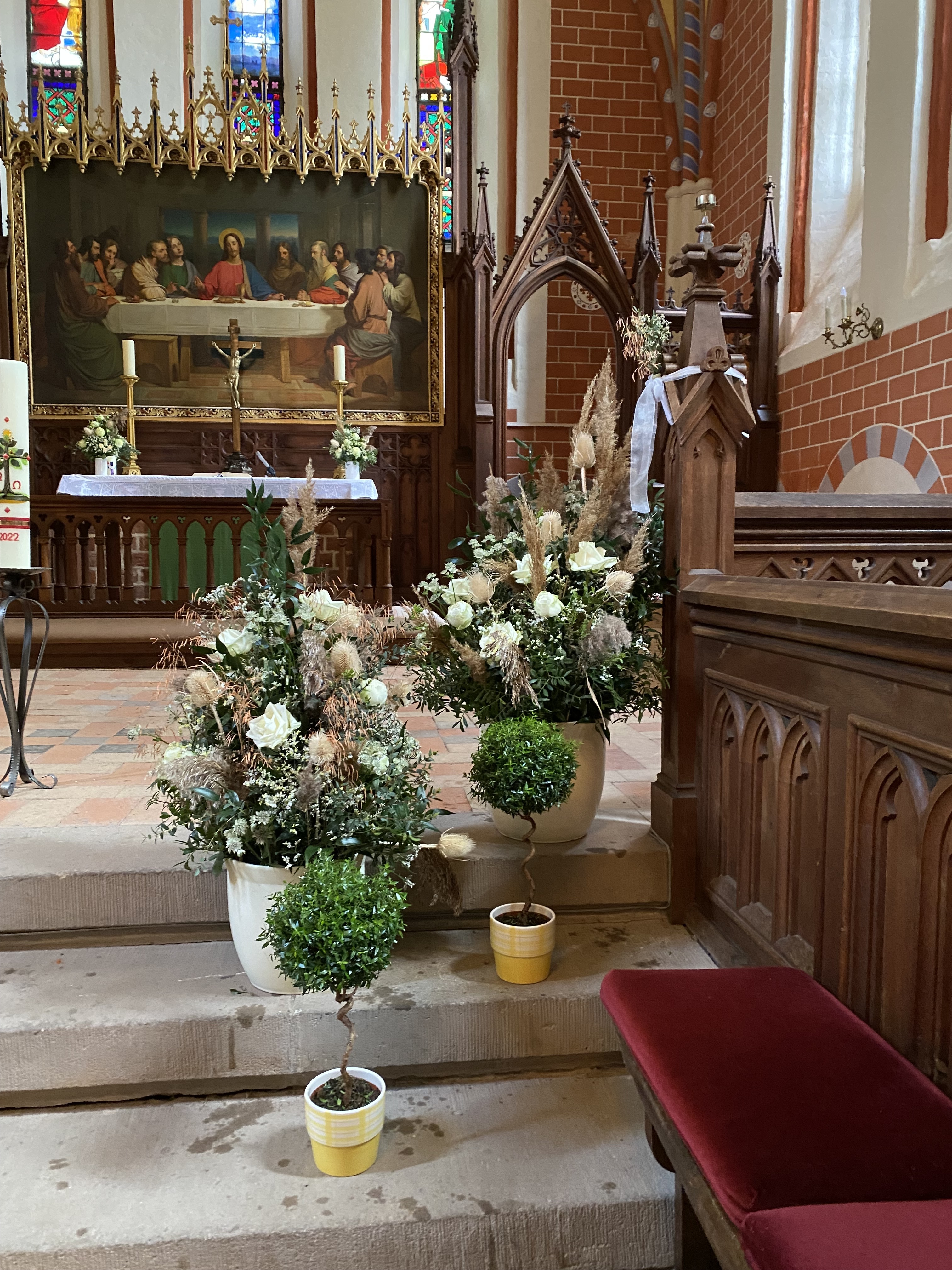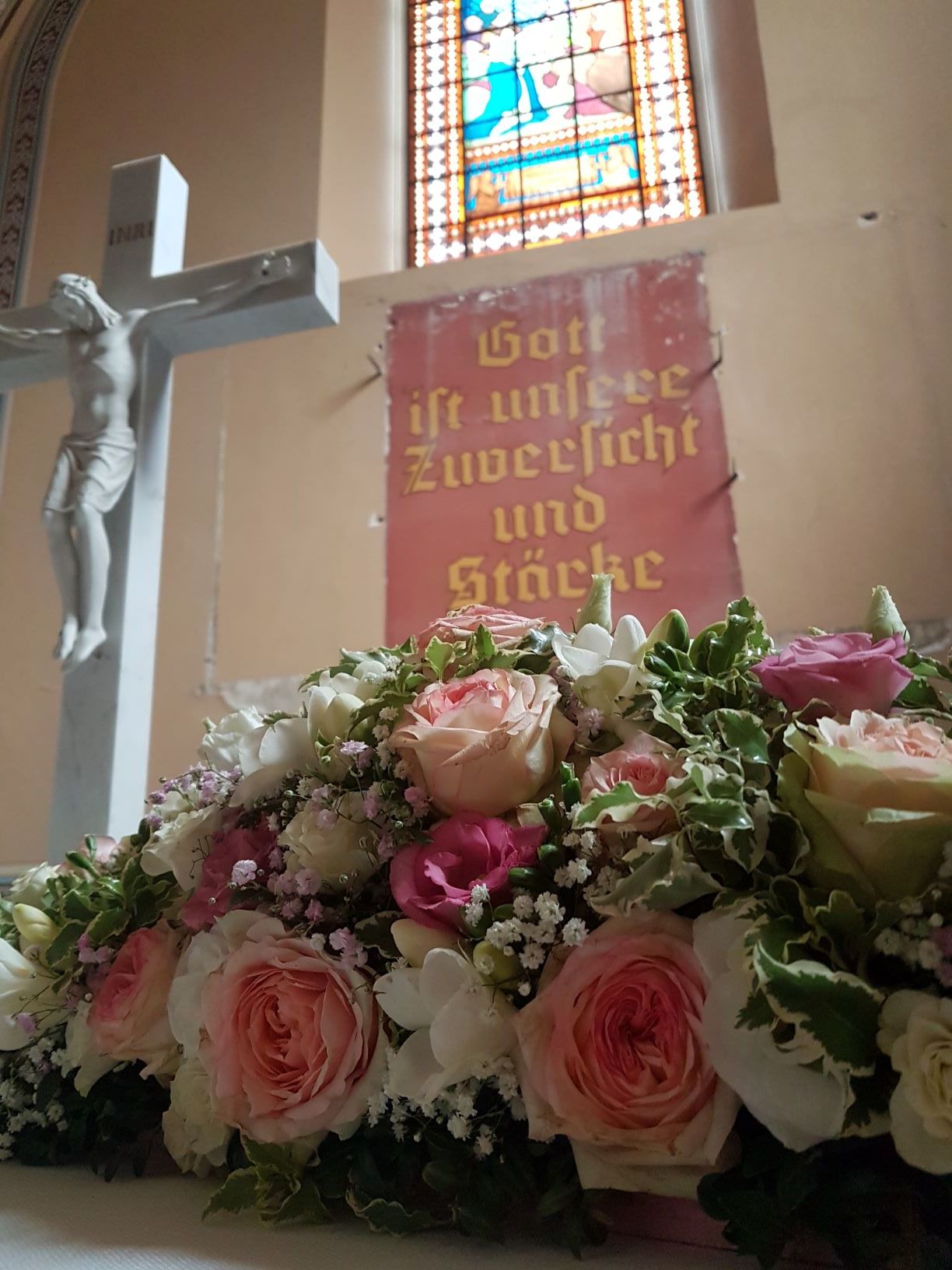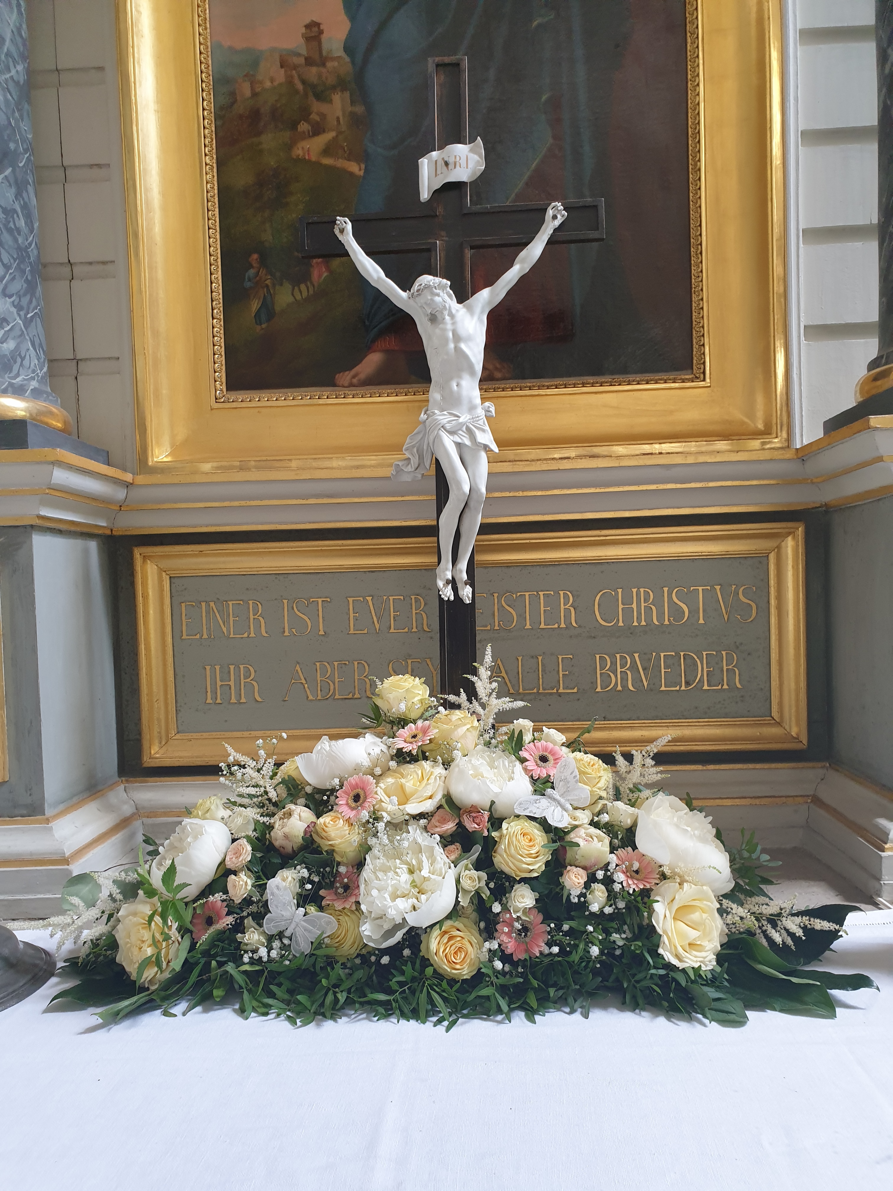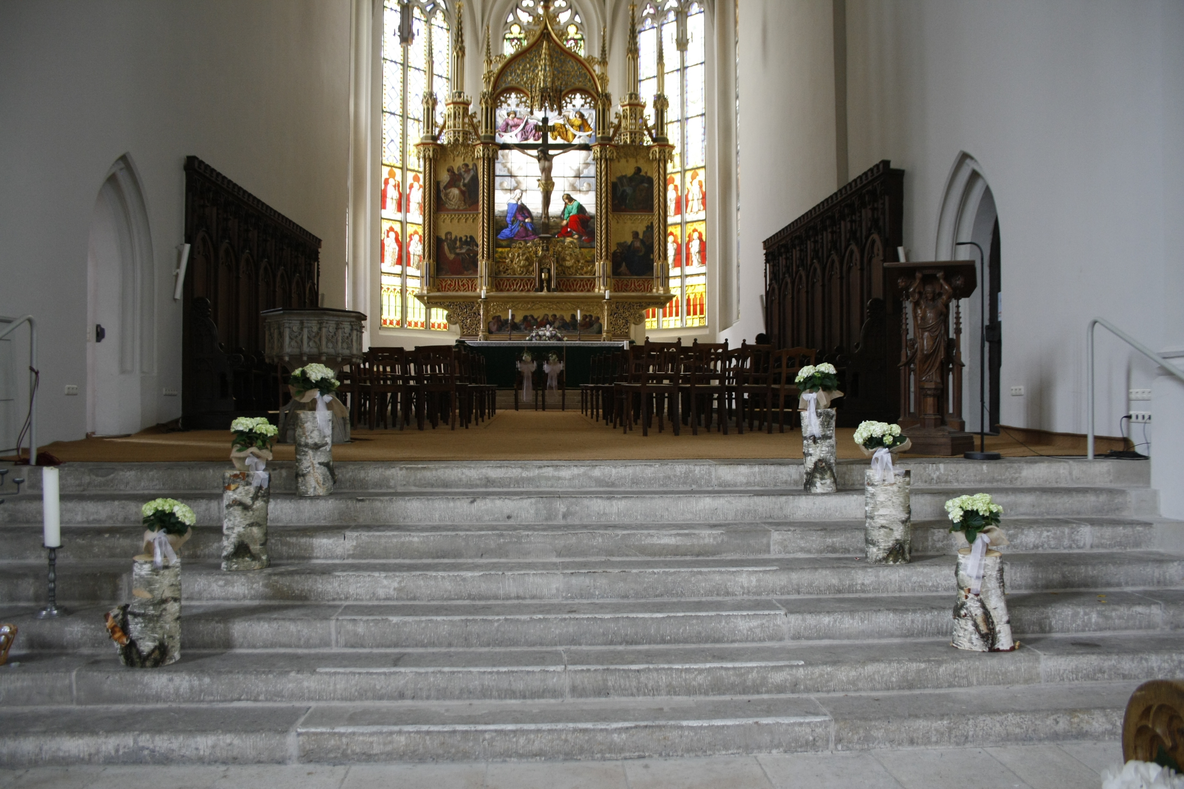 Es ist eine wunderschöne Aufgabe, die besondere Athmosphäre in einer Kirche zu begreifen und ihre eigene Schönheit hervorzuheben. Auch hier wird der Farbwunsch und die Blütenauswahl des Brautpaares dem Raum angepasst und so ensteht ein stimmiges Gesamtbild.