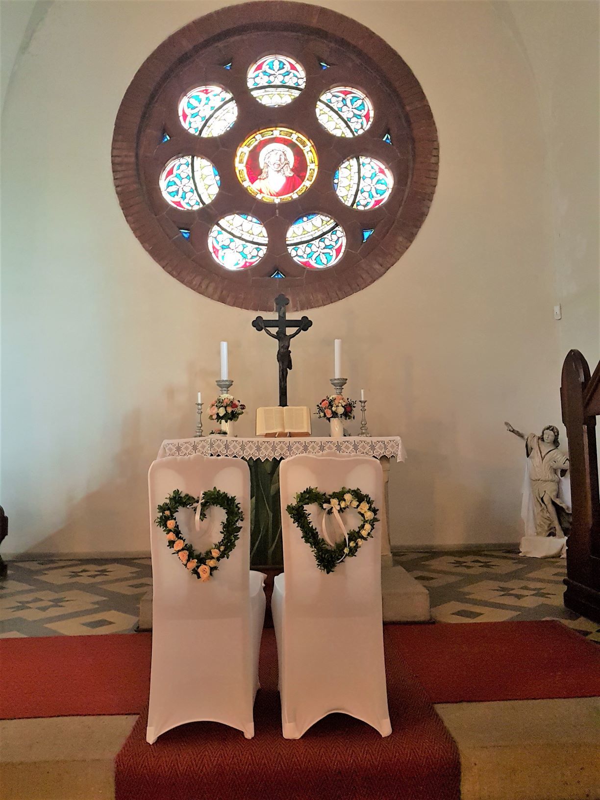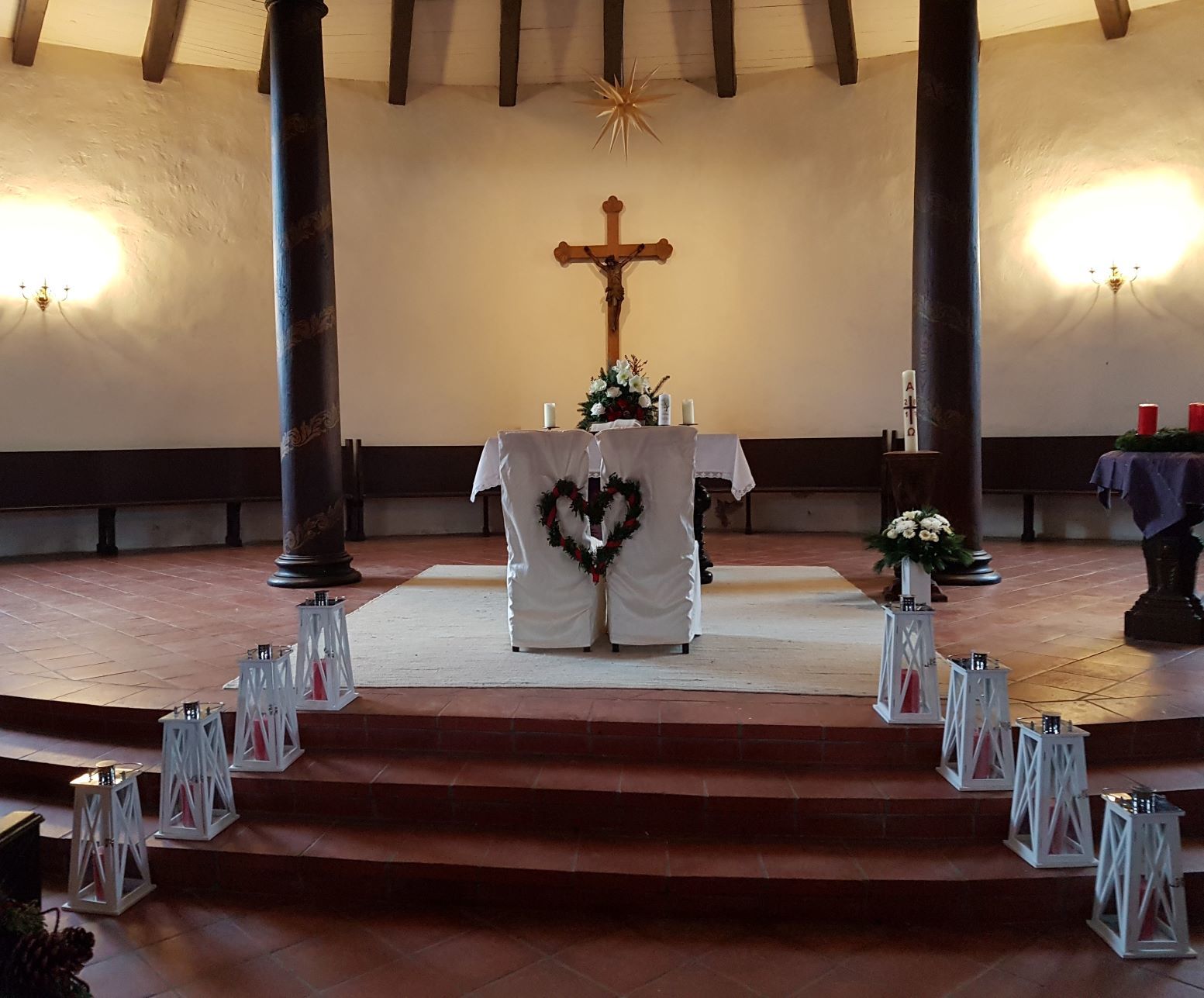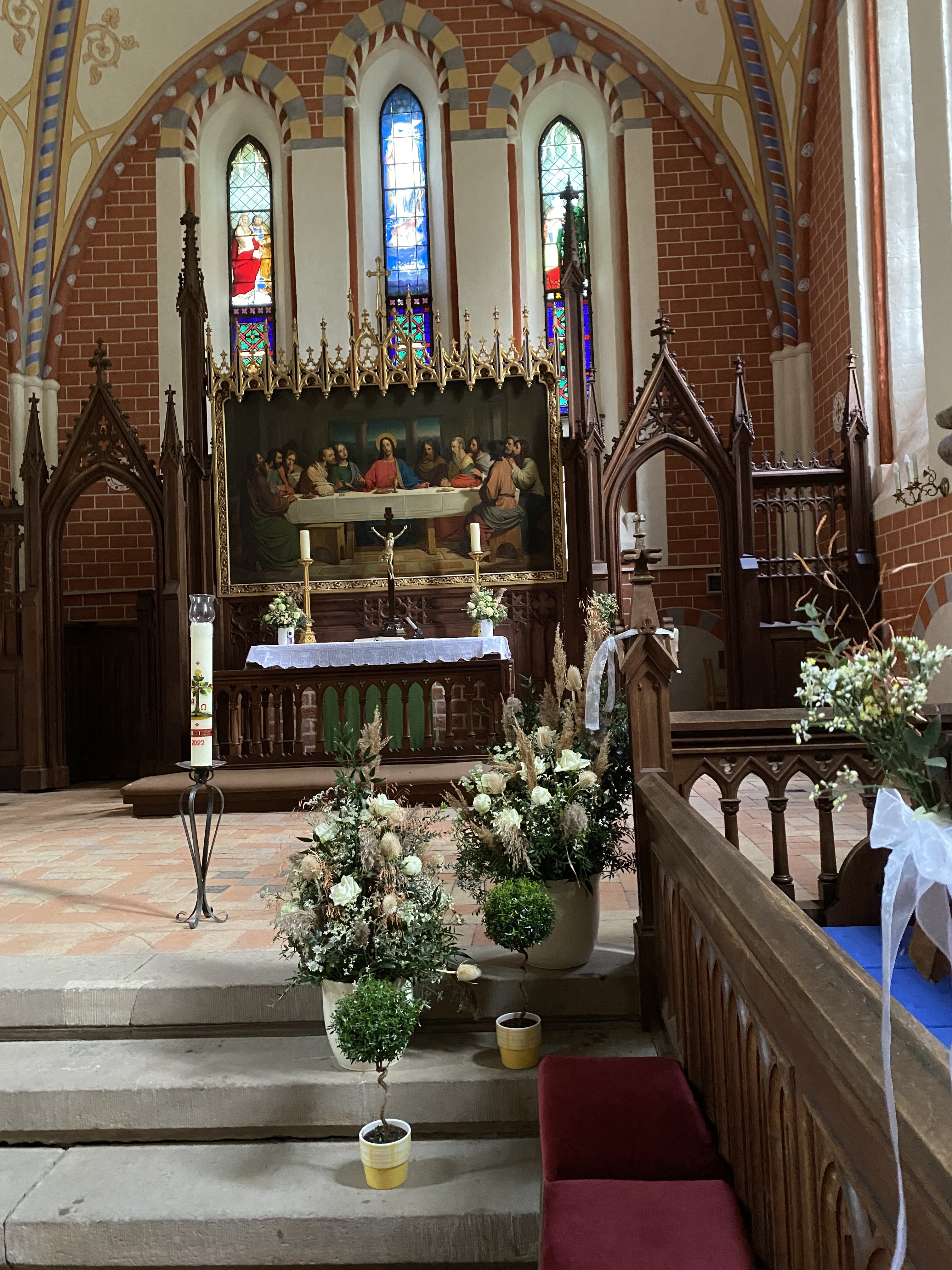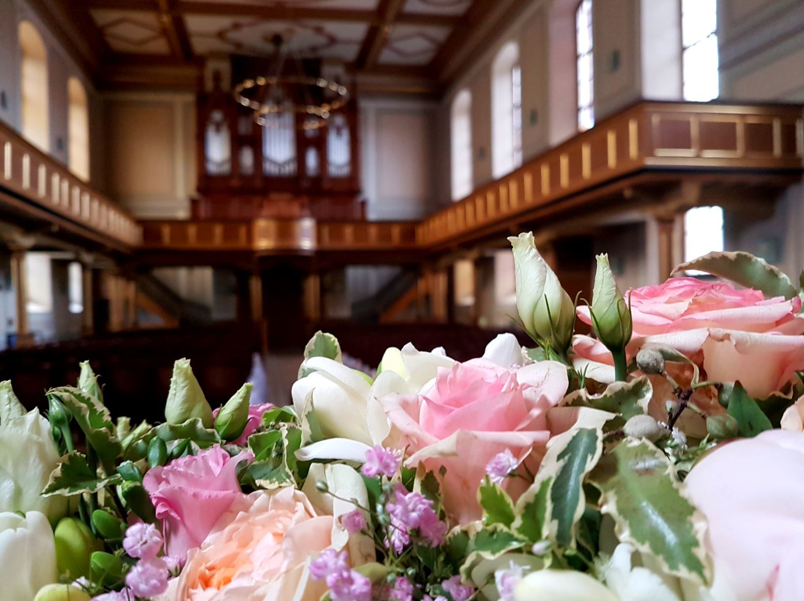 Es ist eine wunderschöne Aufgabe, die besondere Athmosphäre in einer Kirche zu begreifen und ihre eigene Schönheit hervorzuheben. Auch hier wird der Farbwunsch und die Blütenauswahl des Brautpaares dem Raum angepasst und so ensteht ein stimmiges Gesamtbild.