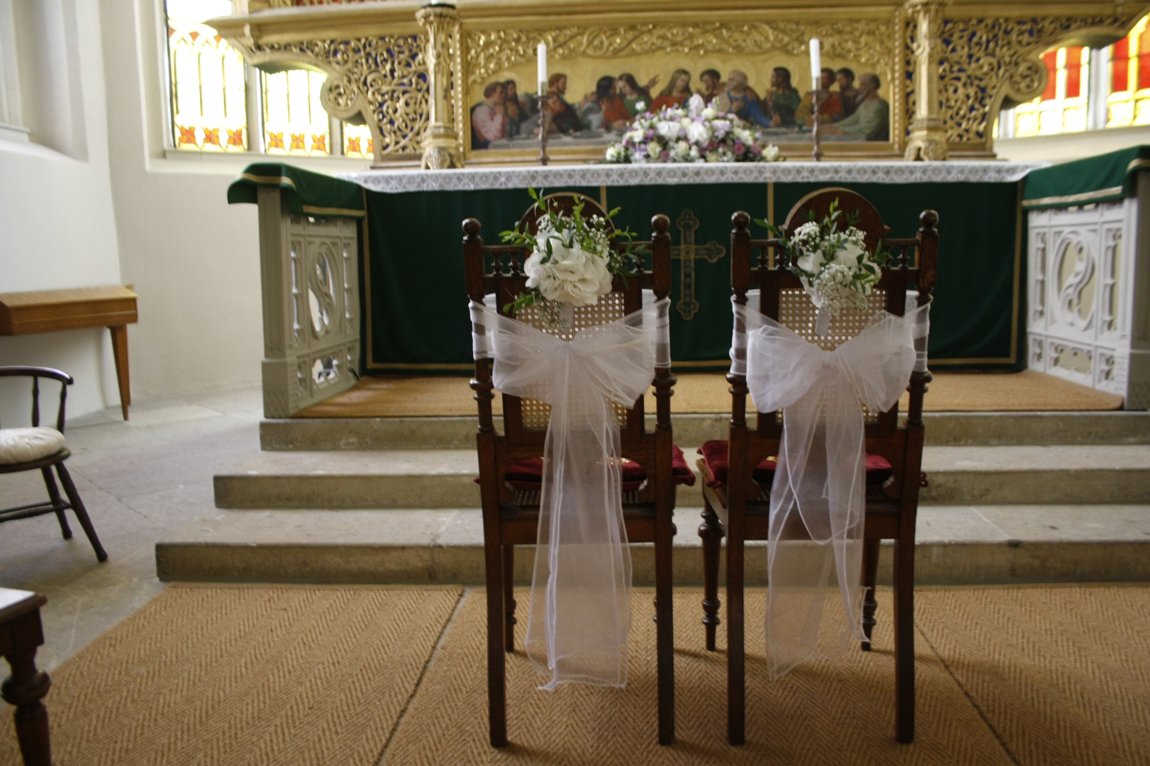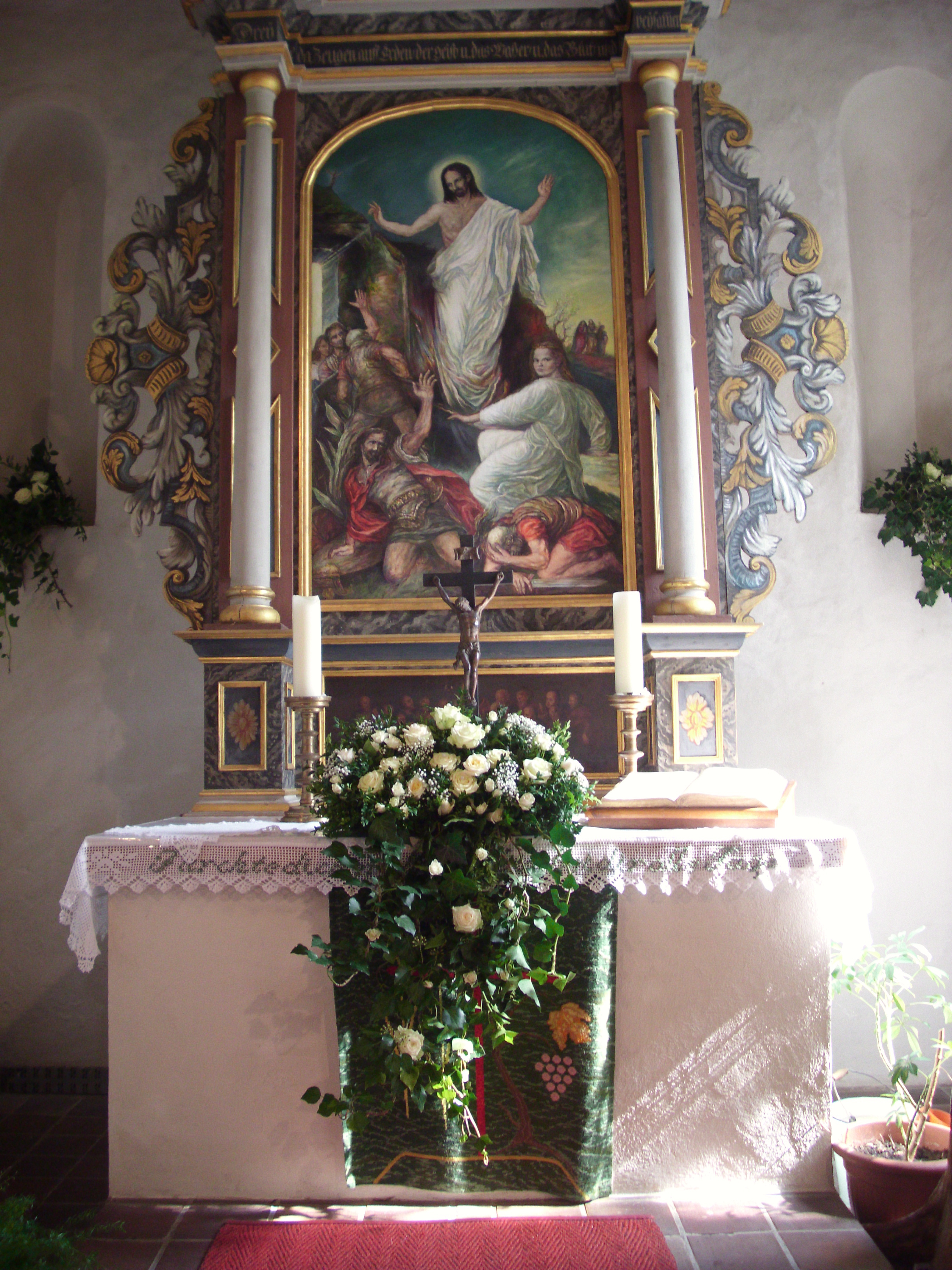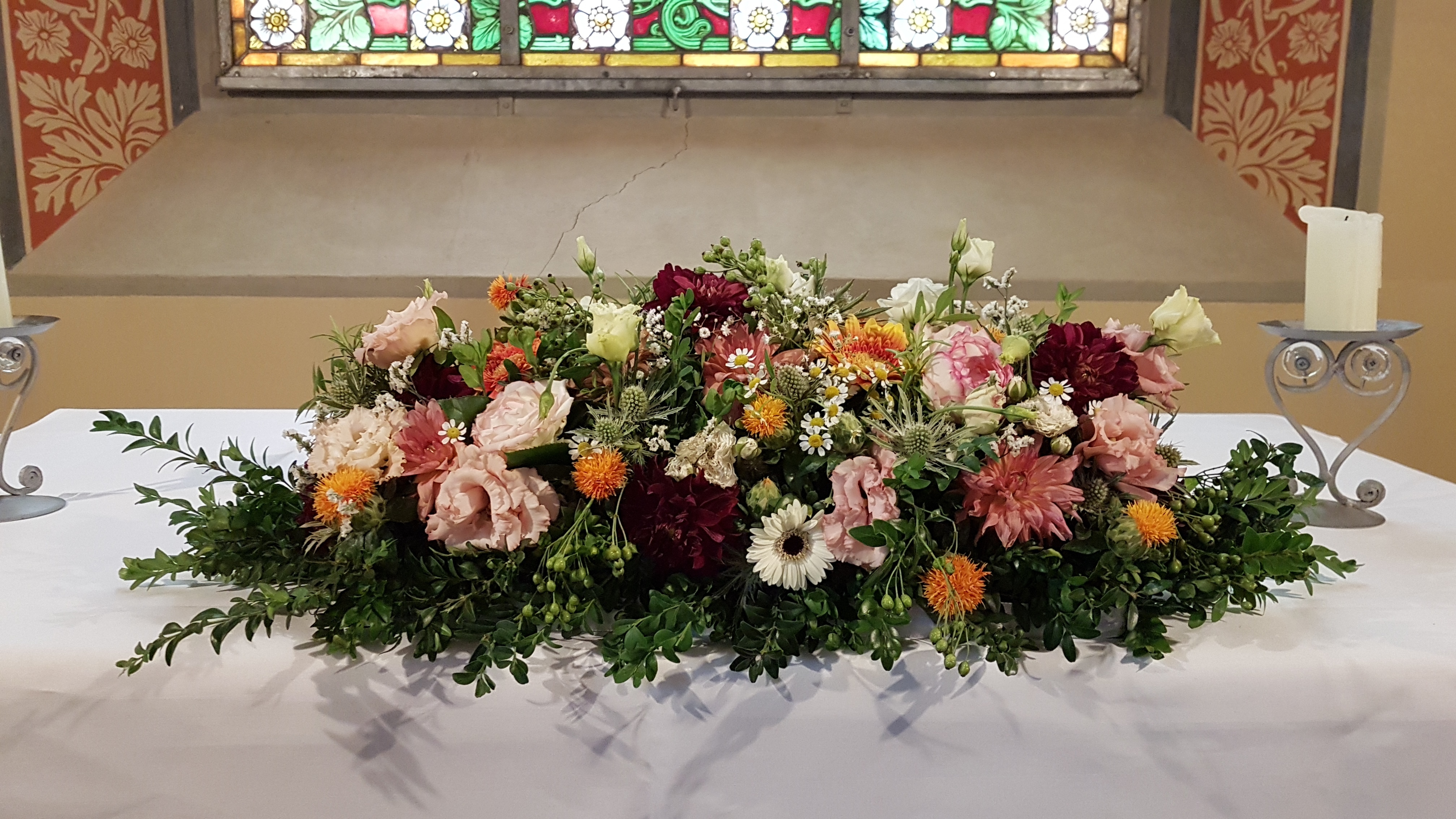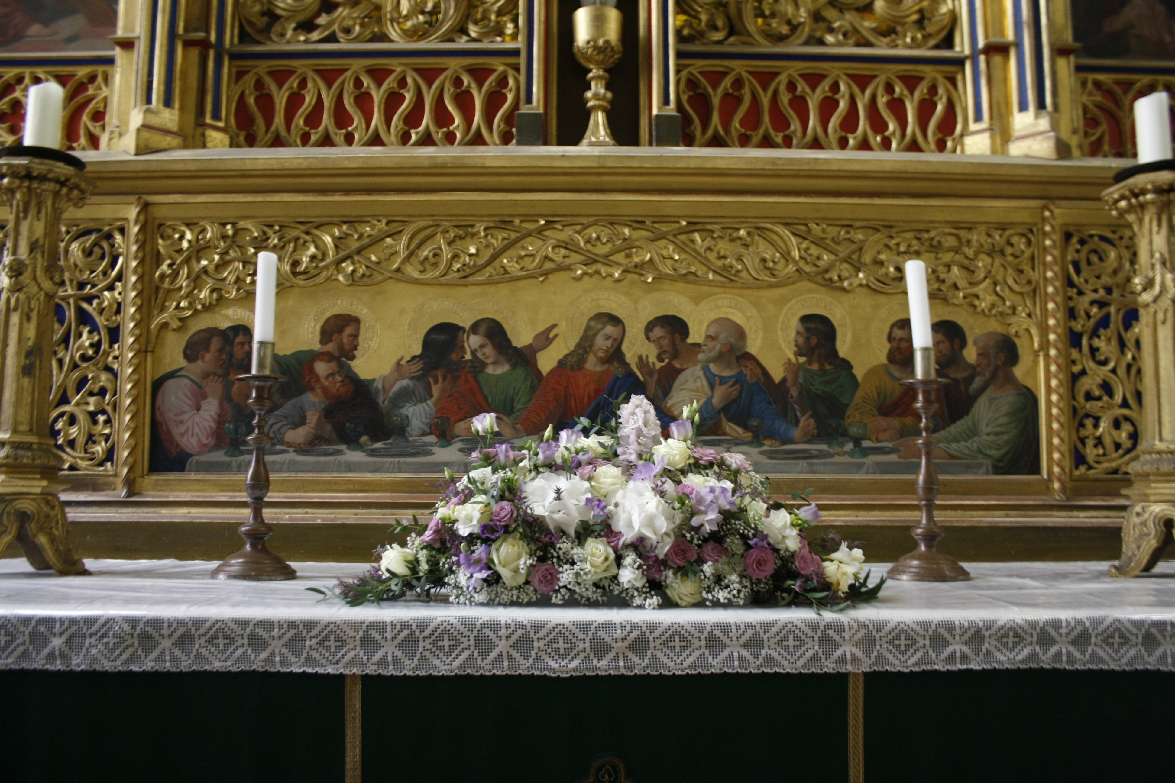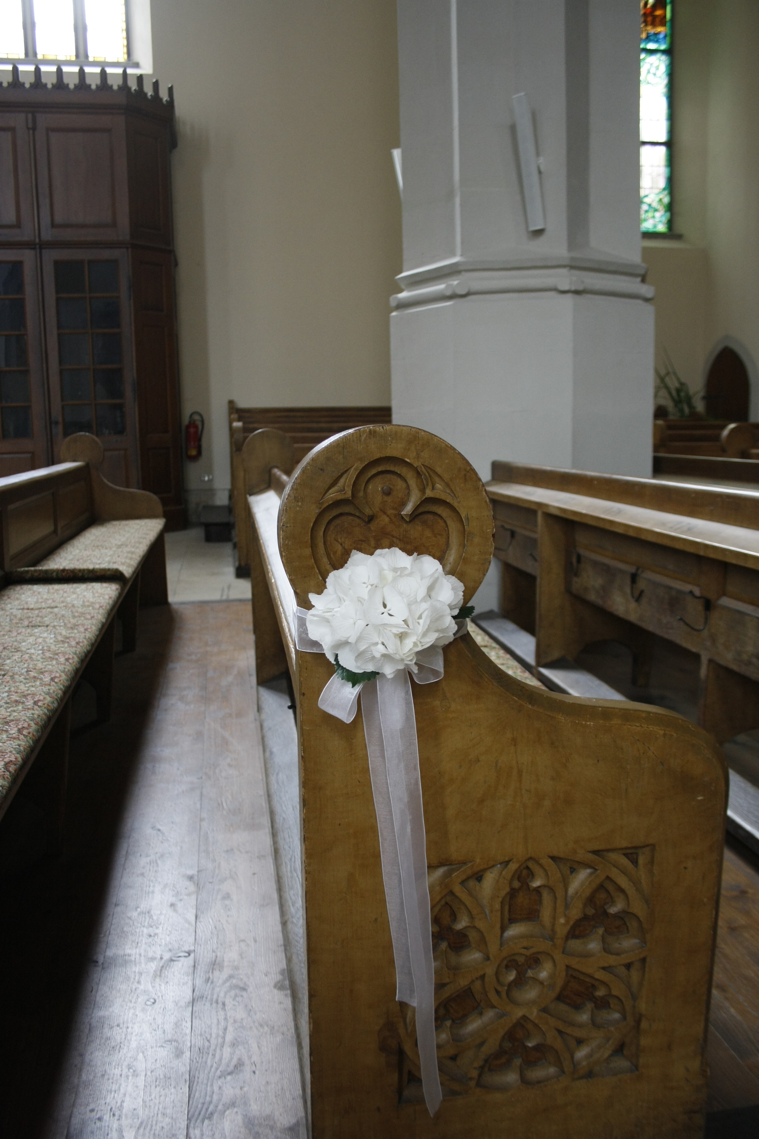 Es ist eine wunderschöne Aufgabe, die besondere Athmosphäre in einer Kirche zu begreifen und ihre eigene Schönheit hervorzuheben. Auch hier wird der Farbwunsch und die Blütenauswahl des Brautpaares dem Raum angepasst und so ensteht ein stimmiges Gesamtbild.